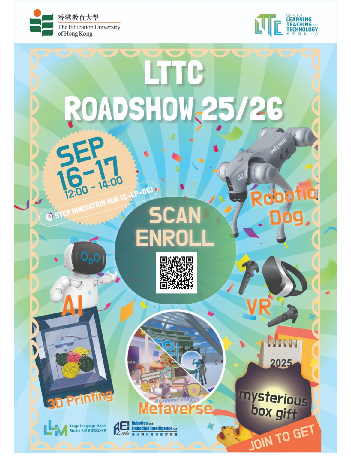 The LTTC Roadshow on September 16–17 was an exceptional experience, attracting over 400 student registrations and creating a lively, engaging atmosphere at the STEM Innovation Hub (C-LP-06). Students participated in 3D printing activities, immersed themselves in the metaverse space with VR headsets, interacted with AI at the LLM station, and learned to operate and understand the mechanisms of the intelligent robotic dogs (i.e., Unitree Go2), which drew significant attention and excitement. The event concluded with students sharing feedback at the evaluation station, where we collected 216 completed forms with overwhelmingly positive responses. Many students expressed interest in joining LTTC workshops in this academic year, showcasing the meaningful impact of the event.