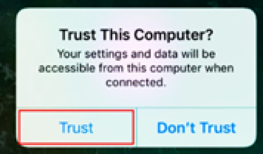 When you connect the iPad to your computer for the first time, you will be prompted to “Trust” the computer on your iPad. Click Trust, this allows iPad to remember the settings and automatically trust the computer in the future.