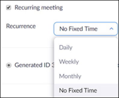 This will create a No Fixed Time (always available) meeting. You will further re-schedule it to daily, weekly and monthly basis using eduhk.zoom.us. Sign in through https://eduhk.zoom.us/ and click Meetings on the left menu, then you can find the meeting topic with the Start Time set to Recurring.