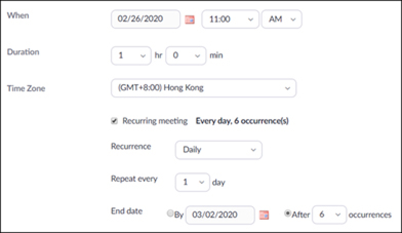 Some students might be having back-to-back classes, and they would easily get confused if the start time of your Zoom class clashes with their other lessons. Therefore, please try to set the start time of your Zoom class as the exact time of when your timetabled session begins. You can still begin your Zoom session earlier than the start time to allow time for students to join the meeting and test their devices.